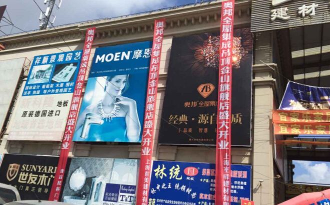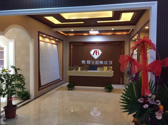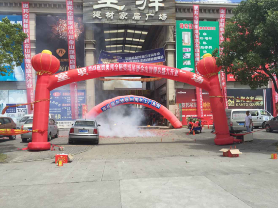 2015年8月7日上午10時18分,位于上海金山區室驛建材家居廣場的奧邦全屋集成頂金山旗艦店隆重開業。漂亮精致的花形拱門,歡慶的禮炮聲預示著開業的火爆氣氛