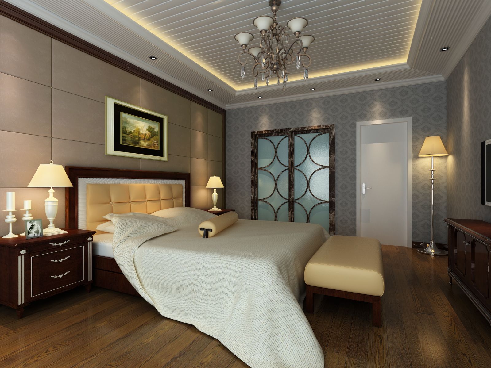 雙列臺燈與門口的落地燈呼應,加大了臥室的照明功能。豎直的吊頂設計,使臥房空間更加簡潔,高雅,配上周圍的燈帶,整體看上去清新、通透。溫暖明媚的晨光,一早上就籠罩在溫暖的光線里,格外迷人,溫馨地讓人不忍離去。